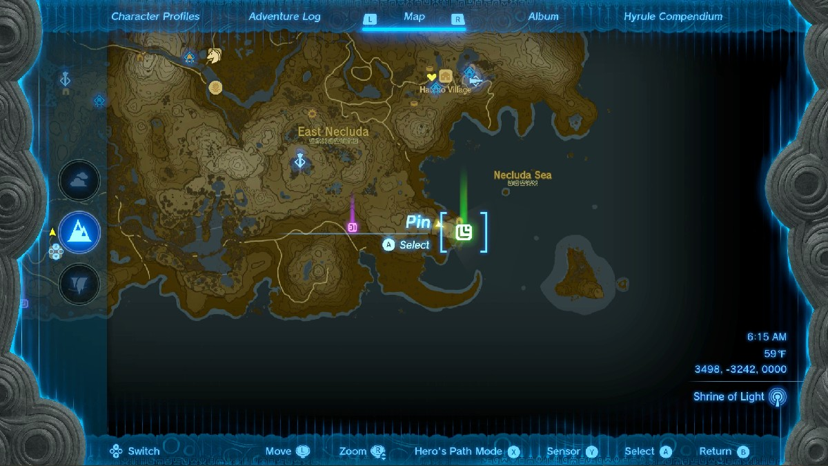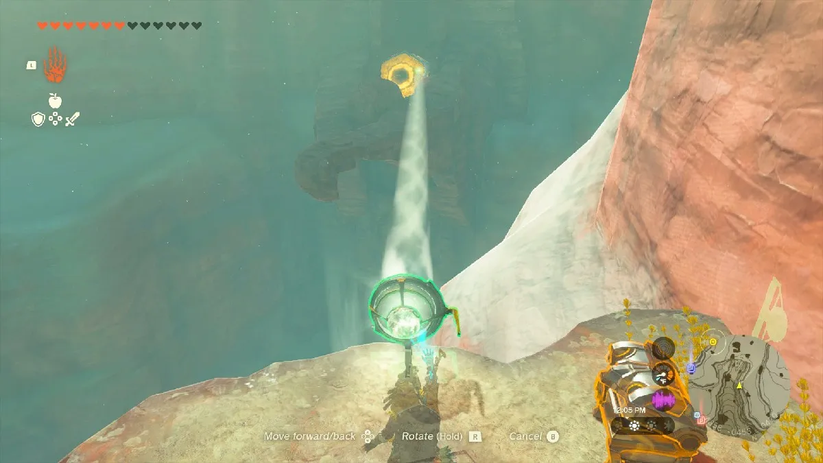 Начните у Башни обзора над Герудскими высокогорьями, координаты (-3959, -1313, 0422), и установите булавку точно в месте, показанном выше, в Герудских горах. Как жаль, что Линку понадобилась Броня планера, а не мои прекрасные воздушные шары, чтобы подняться еще выше при прыжке, но я ухожу от темы.